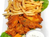 8 chicken wings with fries & soda.